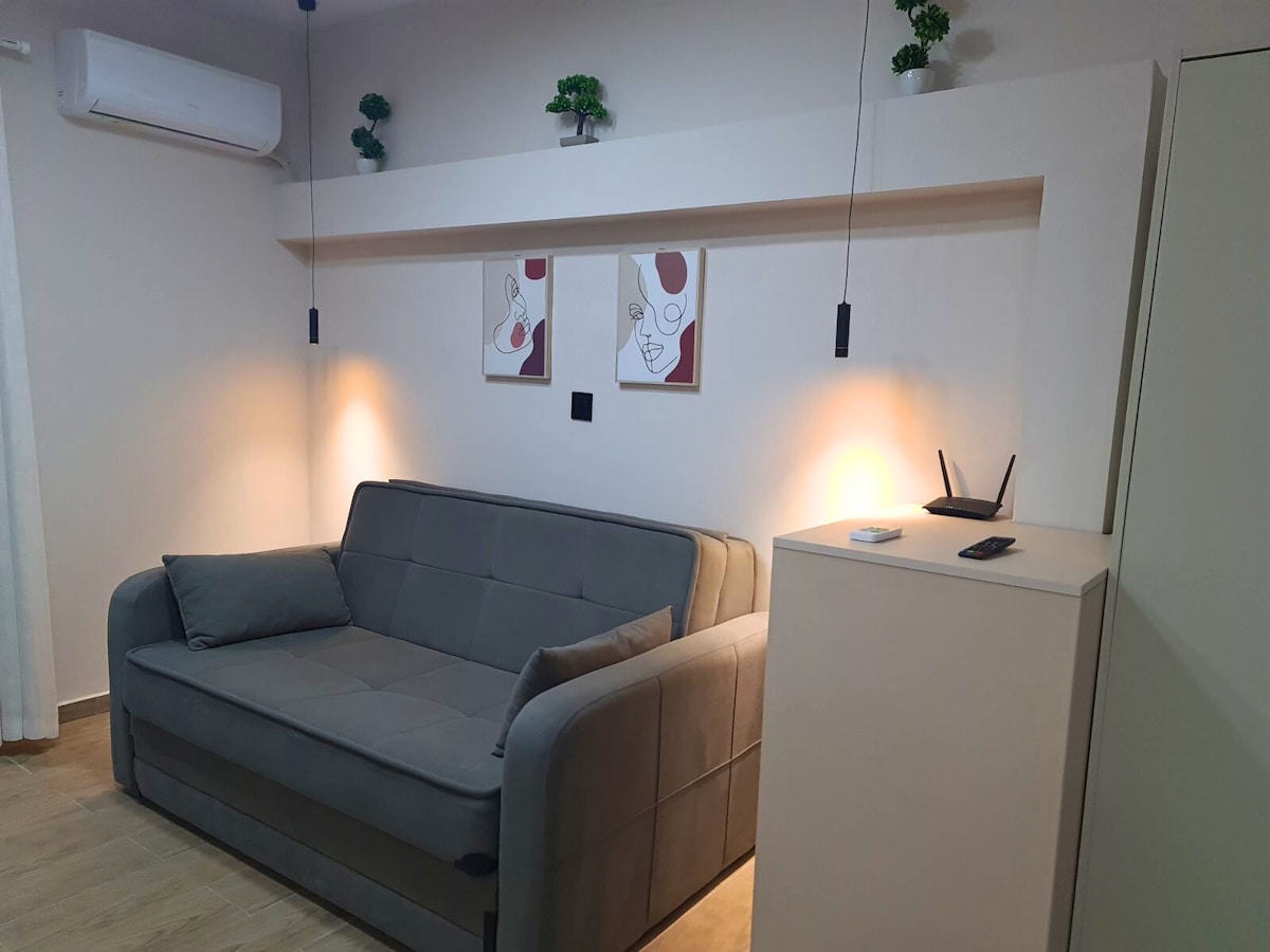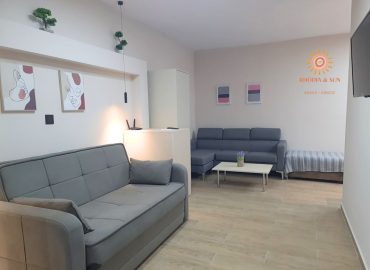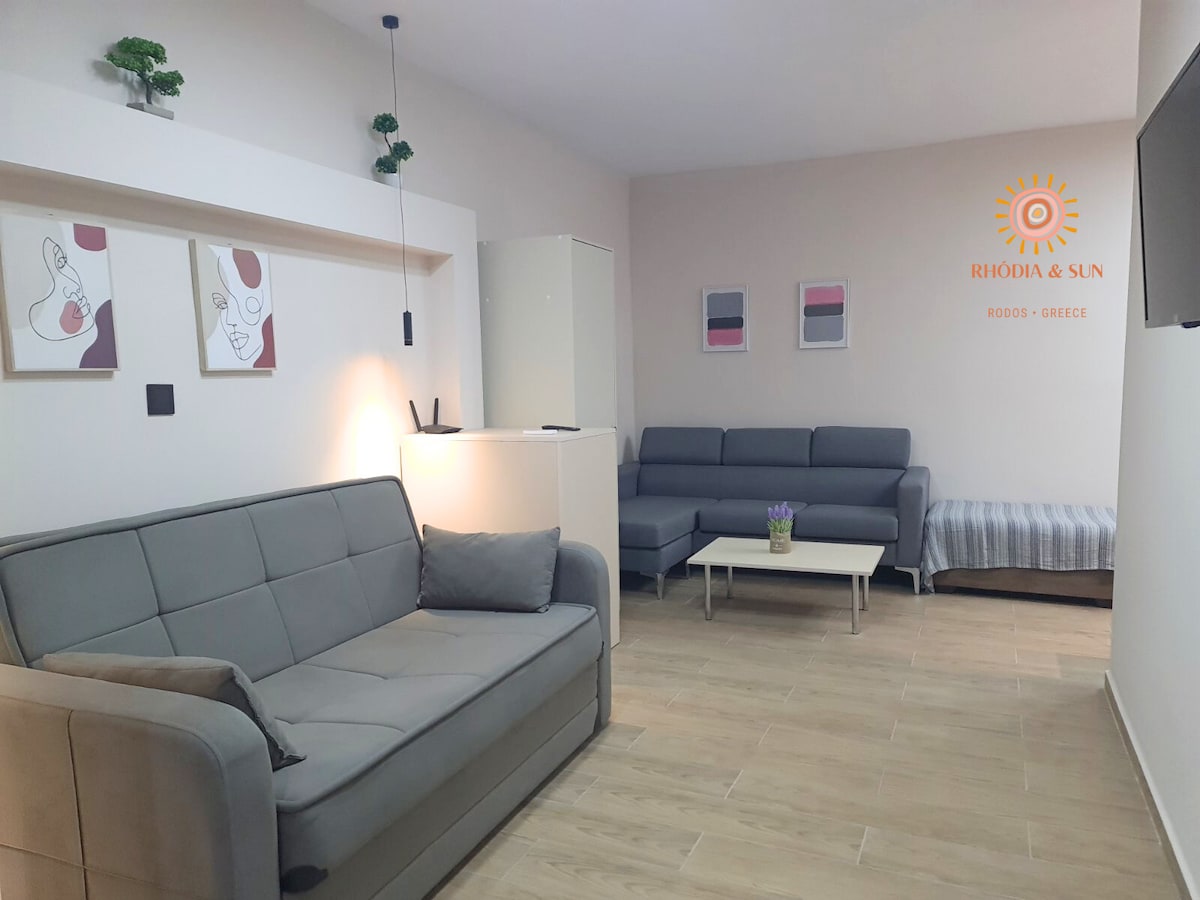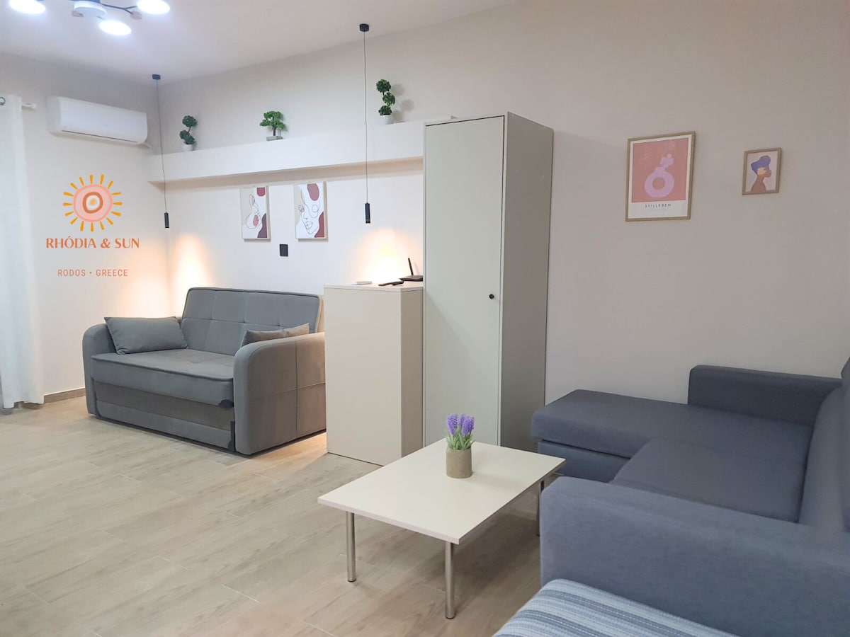 Rhódia & Sun by Booking Kottas is a stylish 52m² apartment in Rhodes, perfect for up to 4 guests. It offers a cozy bedroom with a double bed and a comfortable sofa bed in the living room, both equipped with TV and A/C. The fully equipped kitchen includes an oven, espresso coffee maker, and a dining area. Located on the second floor with elevator access, 150m from Ixia Beach. Modern bathroom, free Wi-Fi, and street parking. An infant child can be accommodated in a baby cot with an extra charge.